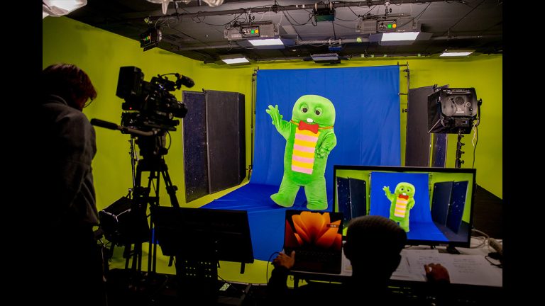 現場に入ったガチャピンは赤色の蝶ネクタイでおめかし。位置を細かく調整しながら撮影しています。