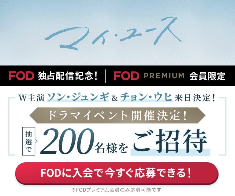 FODプレミアムに登録している会員の皆様だけが応募可能なキャンペーンを開催します。期間中、会員専用の応募フォームより応募いただくと、抽選で200名様をファンイベントへご招待。すでに会員になっている方はもちろん、今からFODプレミアムに新規入会しても応募できますので、是非ご参加ください。